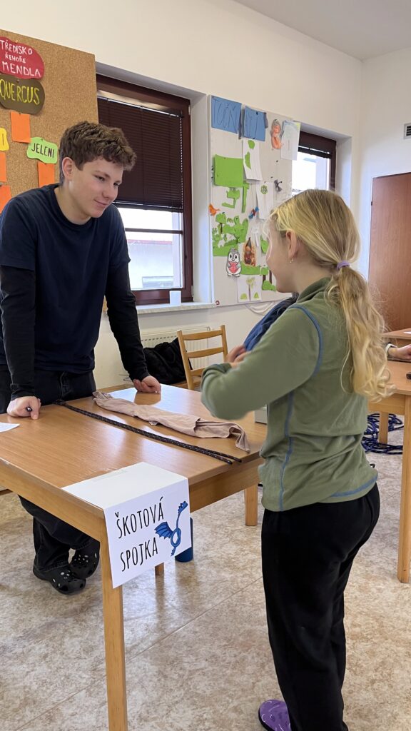 Dopoledne jsme se tedy sešli v klubovně a všechny děti byly obeznámeny s pravidly. Poté šly vázat uzly na různá stanoviště. Musím uznat, že byla vidět snaha všech účastníků. Starší děti a rádci si osvojili nový styl vázání dřevařské smyčky. Ti, kteří byli rychlí a měli hotovo jako první, se mohli rozhodnout mezi dalším zlepšováním v uzlování, nebo si zahrát deskovou hru, kterou si mohli vybrat z naší bohaté nabídky deskových her. Po zhotovení posledního stanoviště byl dopolední program ukončen a šlo se domů na oběd.