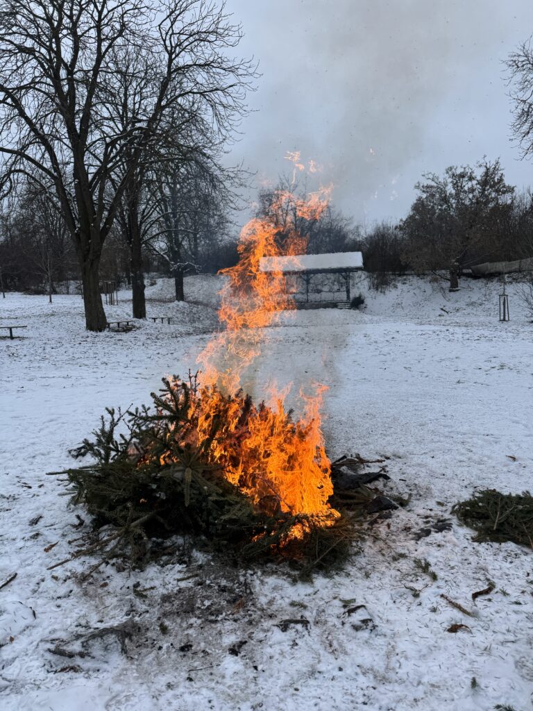 Odpoledne jsme pak tradičně opékali špekáčky nad vánočními stromečky v areálu Pod kaštany za účastí všech kamarádů a rodinných příslušníků. Na místě bylo malé občerstvení v podobě moštu a jelikož byl sníh, bylo postaráno i o zábavu v podobě bobování a sáňkování.