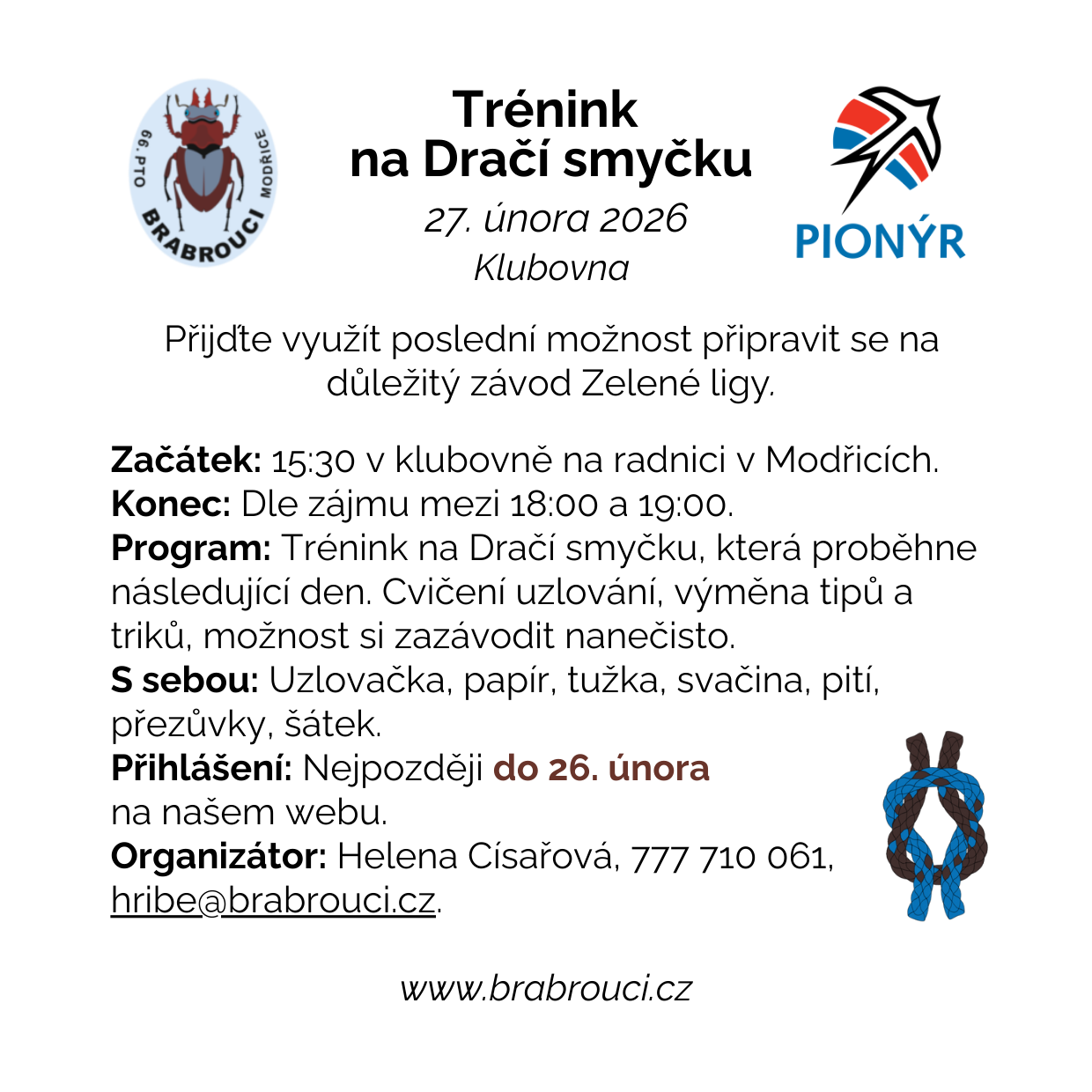 << All Events Trénink na dračí smyčku 27. února 16:00 - 17:00 Na akci se už přihlásili: Přihlas se jako první! Share This Event 1266721 DD DAYS HH HOURS MM MIN SS SEC Podrobnosti Datum: 27. února Čas: 16:00 - 17:00 + Kalendář Google+ iCal Export « Ledová Praha Dračí smyčka » 27 Únor 2026 Trénink na dračí smyčkuTrénink před důležitým závodem Zelené ligy v uzlování. Zjistit víc 28 Únor 2026 Dračí smyčkaDůležitý závod Zelené ligy - tentokrát závod jednotlivců v uzlování. 100Kč Zjistit víc
